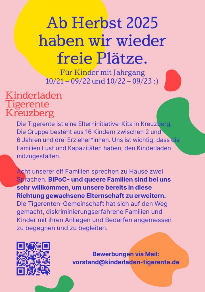 Schreibe gerne eine Nachricht mit Bewerbung und Unterlagen an: vorstand@kinderladen-tigerente.de