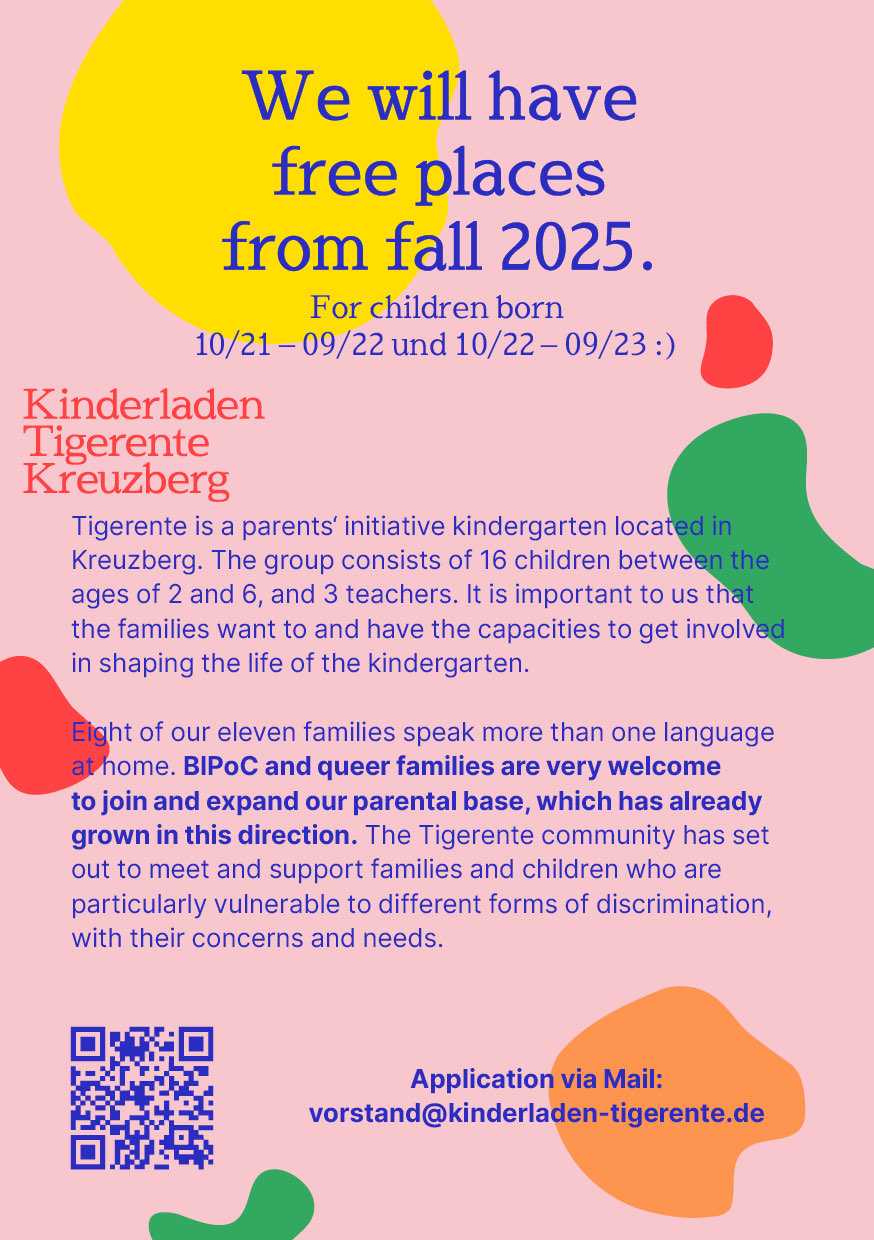 Schreibe gerne eine Nachricht mit Bewerbung und Unterlagen an: vorstand@kinderladen-tigerente.de